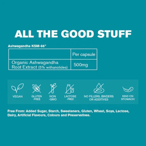 - Extrato de Raiz de Ashwagandha Orgânica (5% withanolides): 500mg