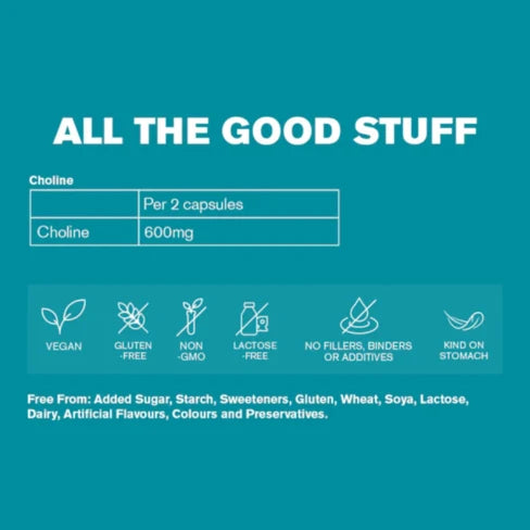 A Colina apoia o metabolismo lipídico e da homocisteína, ajudando a metabolizar hidratos de carbono, proteínas e gorduras em energia. Também desempenha um papel crucial no transporte de gorduras para fora do fígado, ajudando a prevenir o acumular de gordura. Além disso, a Colina é importante para a função dos neurotransmissores e é um nutriente essencial durante a gravidez.