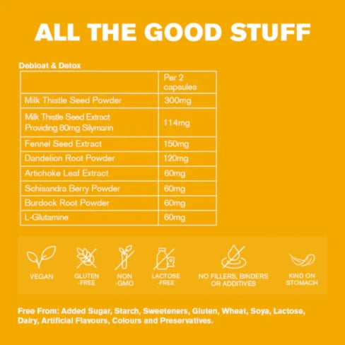 Pó de Sementes de Cardo Mariano, Extrato de Sementes de Funcho, Pó de Raiz de Dente-de-leão Orgânico, Extrato de Sementes de Cardo Mariano, Pó de Raiz de Bardana, Extrato de Folha de Alcachofra, L-Glutamina, Pó de Bagas de Schisandra, Invólucro da Cápsula (HPMC).