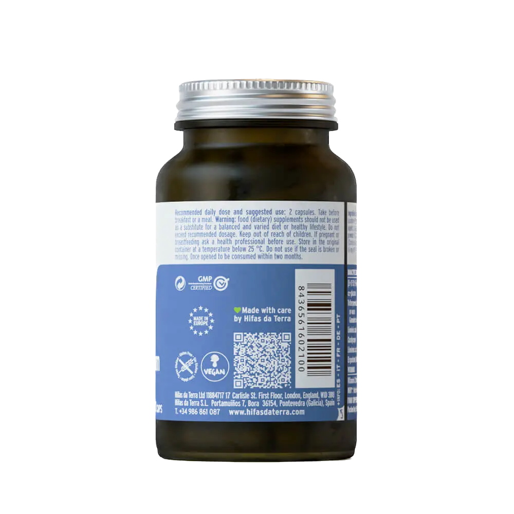 Hifas Equilibrium é um suplemento natural desenvolvido para apoiar o equilíbrio feminino, utilizando cogumelos adaptogénicos: Reishi, Juba de Leão e Cordyceps. Esta fórmula inclui vitamina C natural da acerola para melhorar a biodisponibilidade dos extratos, promovendo o bem-estar geral e o equilíbrio.