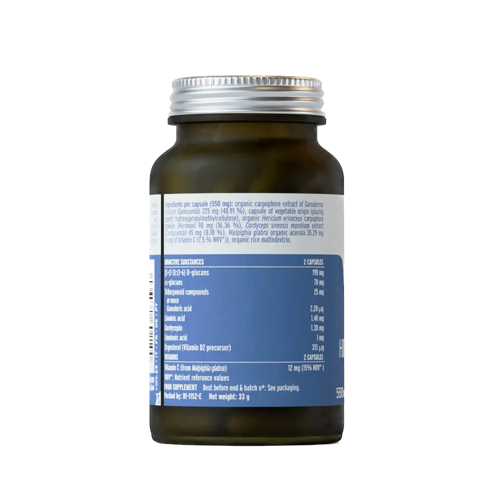 Extrato Orgânico de Reishi (Ganoderma lucidum Ganozumib®) 225 mg, Pó Micronizado Orgânico de Juba de Leão (Hericium erinaceus Herimax®) 90 mg, Extrato Puro Biofermentado de Cordyceps (Cordyceps sinensis Cordyzumib®) 45 mg, Pó Orgânico de Acerola (Malpighia glabra) 35,29 mg.