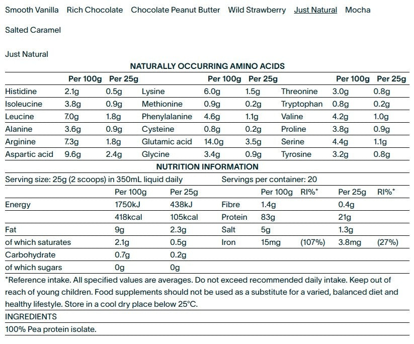 Clean Lean Protein é um pó proteico vegetal premium feito de isolado de ervilha dourada europeia. Livre de glúten, laticínios, soja, OGM e dos principais alérgenos. Fornece todos os nove aminoácidos essenciais, apoia a recuperação muscular, vitalidade e bem‑estar geral, sendo uma fonte natural de ferro. Ideal para nutrição limpa com processamento mínimo.