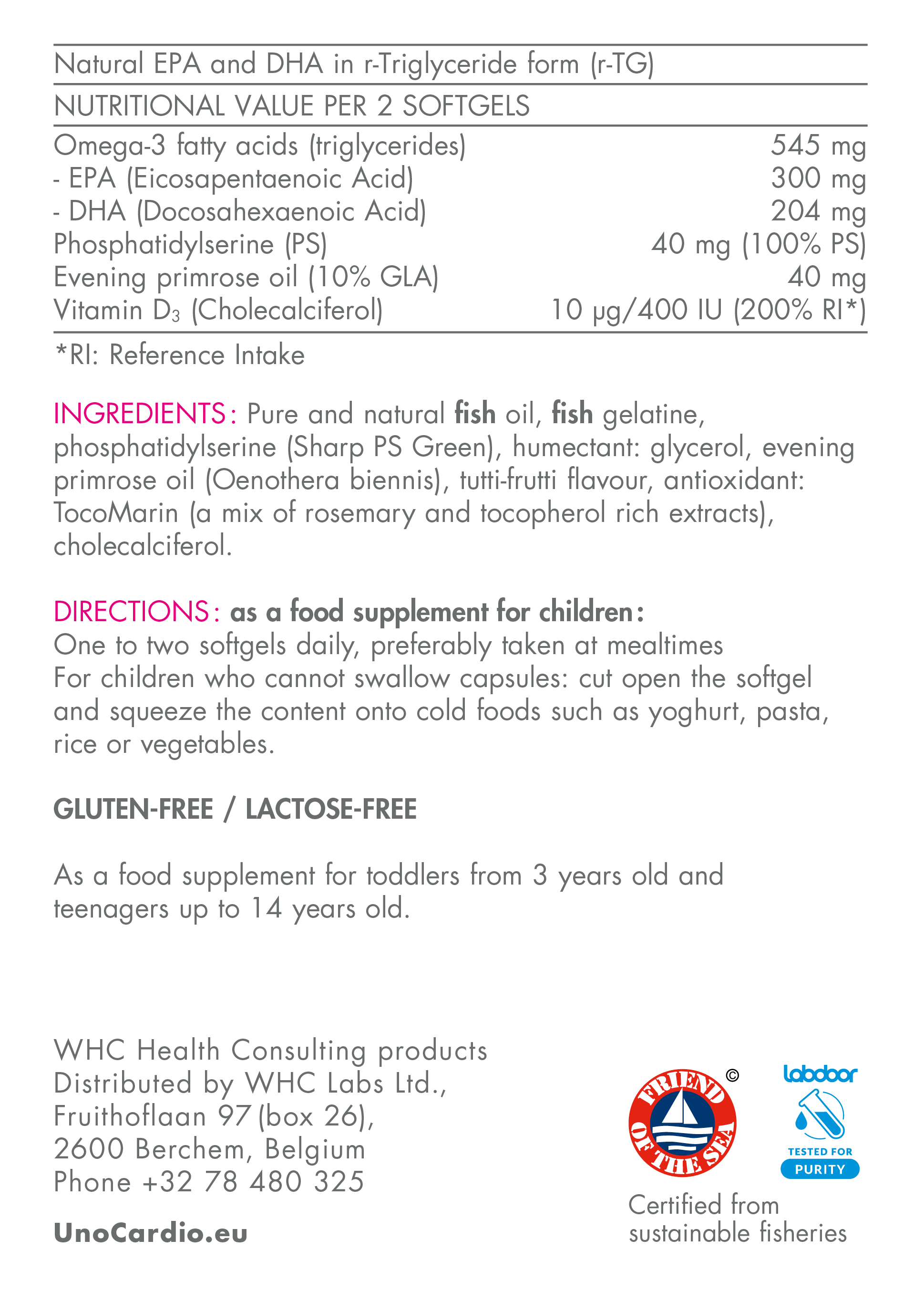 QuattrO3 + PS da WHC Labs é um suplemento de alta qualidade com ómega-3, vitamina D3 e fosfatidilserina, especialmente desenvolvido para apoiar crianças dos 3 aos 14 anos. Certificado pelo IFOS 5*, garante máxima pureza, segurança e qualidade. Fornece 545 mg de ómega-3 puro por dose com EPA (300 mg) e DHA (204 mg), 400 UI de vitamina D3 natural e 40 mg de fosfatidilserina para promover a saúde cerebral, cardíaca e óssea.