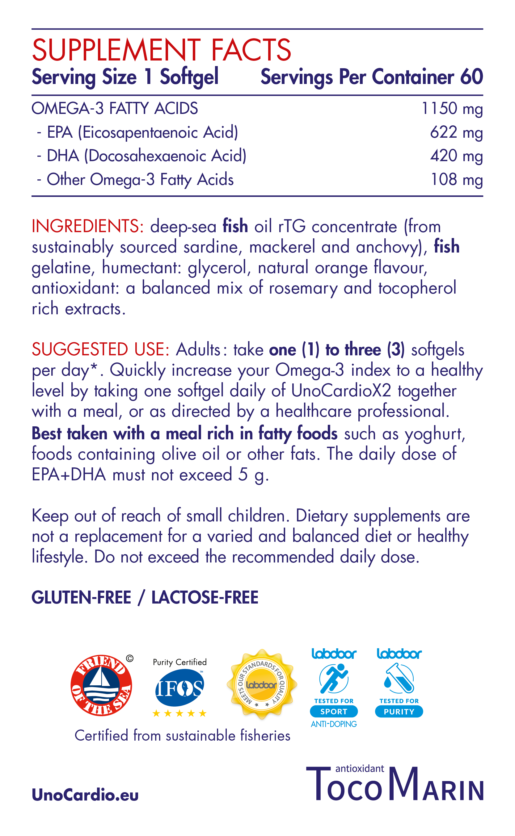 O Uno Cardio X2 da WHC Labs fornece 1150 mg de Ómega-3 por cápsula, com uma concentração de 95%. Certificado pela IFOS 5*, apoia a saúde do coração, cérebro e visão. Altamente biodisponível na forma de r-Triglicerídeos, o Uno Cardio X2 é puro, sustentável e adequado para flexivegetarianos.