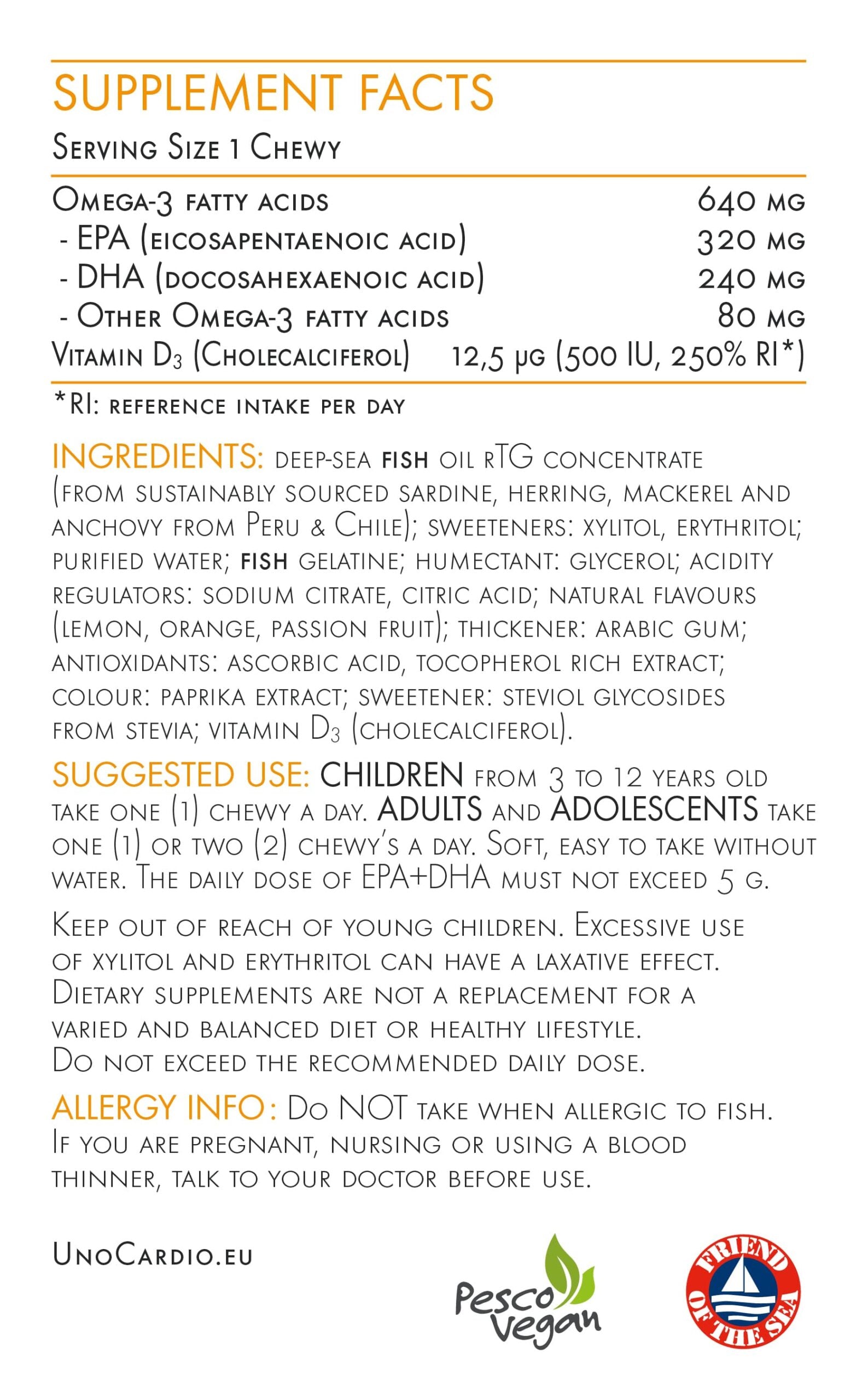 O UnoCardio Chewy da WHC Labs oferece 640 mg de Ómega-3 por cápsula mastigável com uma concentração de 95%. Adequado para idades dos 3 aos 103, apoia a saúde do coração, cérebro, sistema imunológico e ossos. Enriquecido com 500 UI de Vitamina D3 na sua forma natural, este suplemento sem açúcar e amigo dos dentes combina óleo de peixe de alta pureza em forma de r-Triglicerídeos com deliciosos sabores de fruta. Certificado pela IFOS 5*.